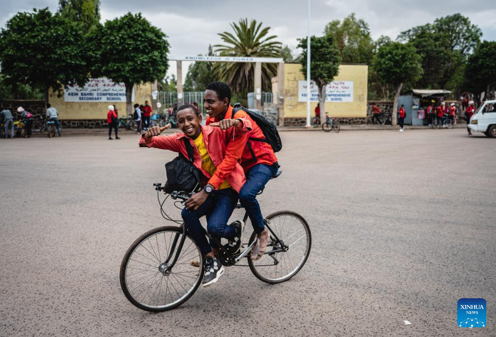 Children ride a bike in Asmara, Eritrea, May 9, 2023. Cycling has been incorporated into locals' life and become a major sport in Eritrea. (Xinhua/Wang Guansen)