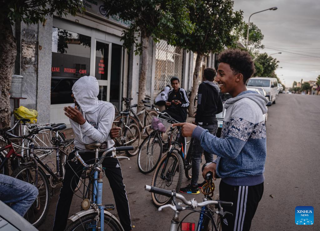 People hang out with their bikes in Asmara, Eritrea, May 8, 2023. Cycling has been incorporated into locals' life and become a major sport in Eritrea. (Xinhua/Wang Guansen)