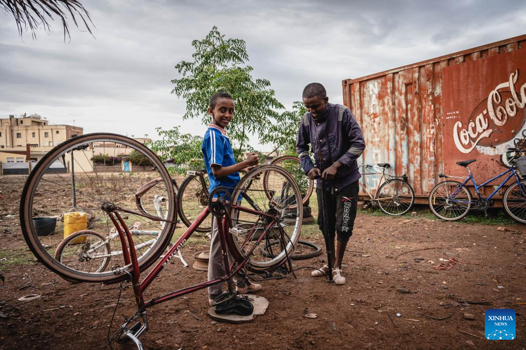 Children repair bikes in Asmara, Eritrea, May 8, 2023. Cycling has been incorporated into locals' life and become a major sport in Eritrea. (Xinhua/Wang Guansen)