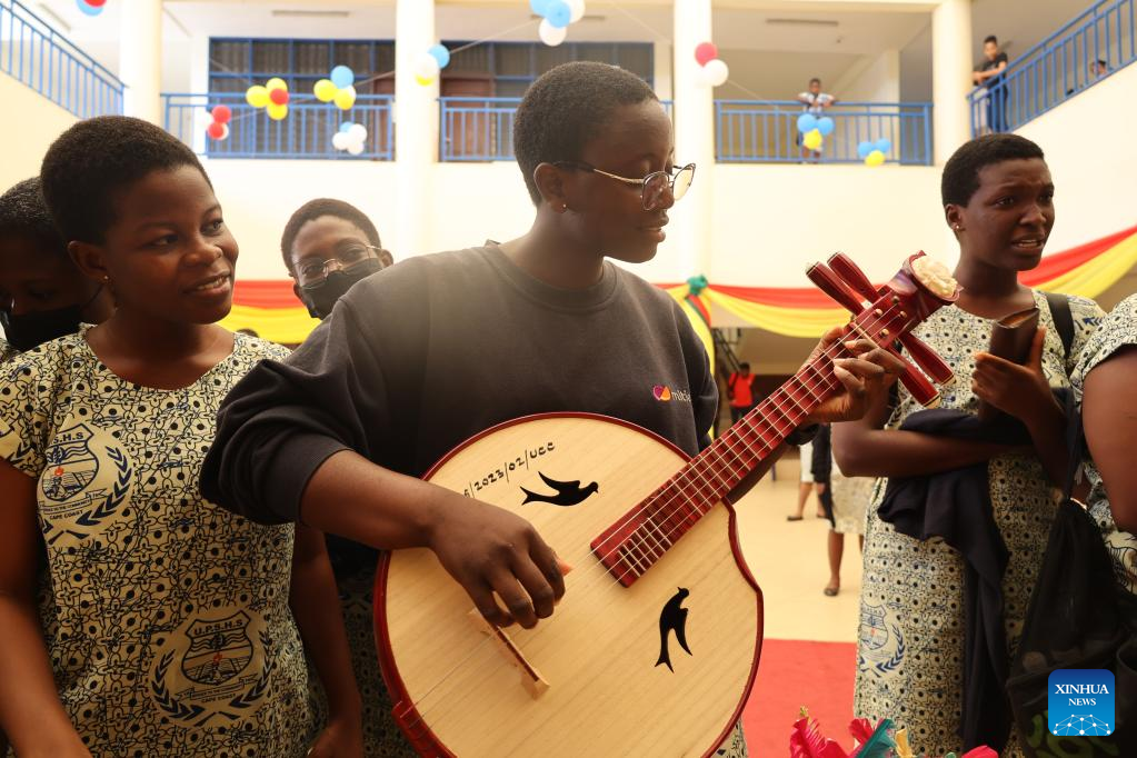 A student plays a traditional Chinese musical instrument at an exhibition of the Chinese culture week in the University of Cape Coast in Cape Coast, Ghana, on June 17, 2023. The University of Cape Coast, one of the most prestigious universities in Ghana, has kicked off its annual Chinese culture week here with spectacular shows and displays. (Photo by Seth/Xinhua)