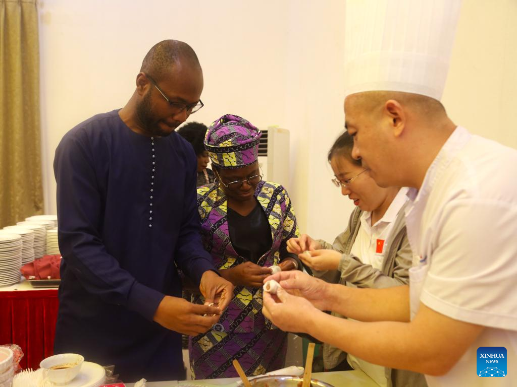 Visitors learn to make dumplings during a Chinese culture open day organized in Lome, Togo, on June 21, 2023. (Photo by Tian Yun/Xinhua)