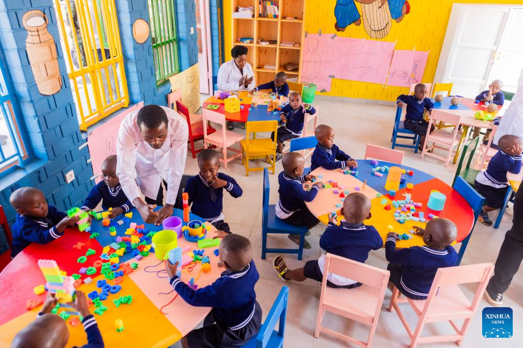 A teacher helps children at the Early Childhood Development Center inside the Rugerero Model Village in Rubavu district, Western Province, Rwanda, July 4, 2023. Rwanda on Tuesday celebrated the 29th anniversary of the liberation by inaugurating Rugerero Integrated Development Project Model Village that will house 120 selected vulnerable families in the Rubavu district in Western Province.(Photos by Cyril Ndegeya/Xinhua)