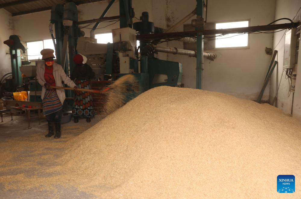 Workers process rice at the China-Mozambique Agricultural Technology Demonstration Center in Boane district of Maputo Province, Mozambique, July 25, 2023. Built in 2010, the demonstration center is an important cooperation project between the Chinese and Mozambican governments. Apart from doing agricultural experiments, the center is also involved in the training of local farmers. (Xinhua/Dong Jianghui)