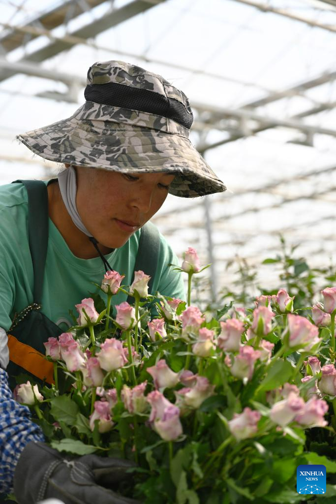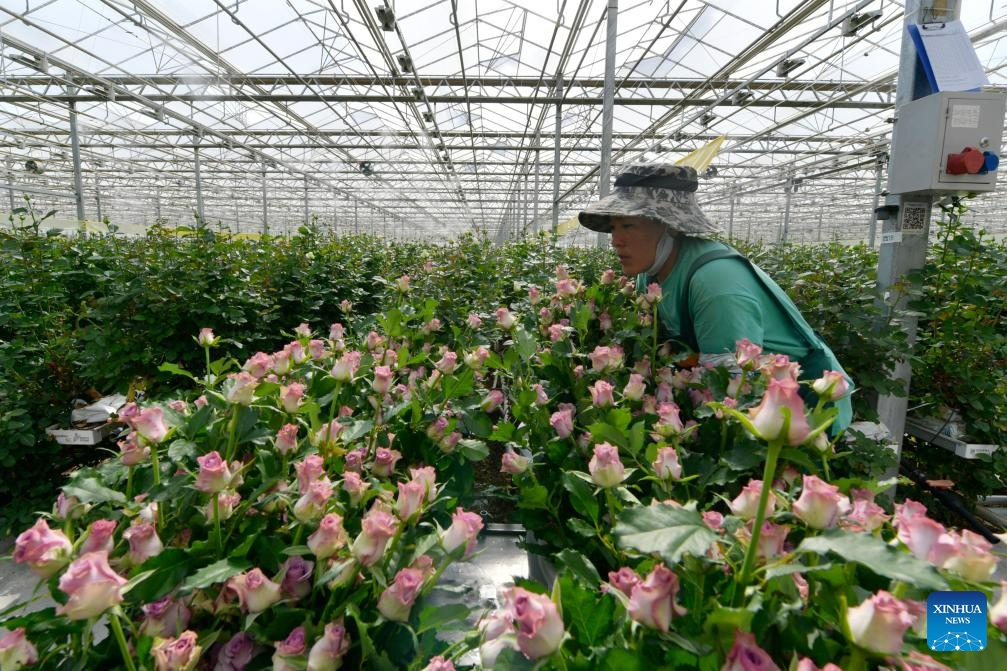A staff member picks roses at a modern agricultural demonstration garden in Lanzhou New Area, Lanzhou, northwest China's Gansu Province, Aug. 1, 2023. By the end of July this year, the garden had produced more than 60 million fresh cut roses, with sales revenue exceeding 60 million yuan (about 8.4 million U.S. dollars). (Xinhua/Ma Ning)
