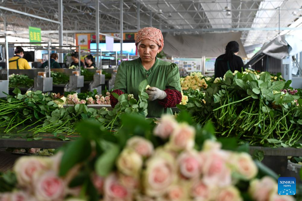 A staff member arranges newly-picked roses at a modern agricultural demonstration garden in Lanzhou New Area, Lanzhou, northwest China's Gansu Province, Aug. 1, 2023. By the end of July this year, the garden had produced more than 60 million fresh cut roses, with sales revenue exceeding 60 million yuan (about 8.4 million U.S. dollars). (Xinhua/Zhang Keren)