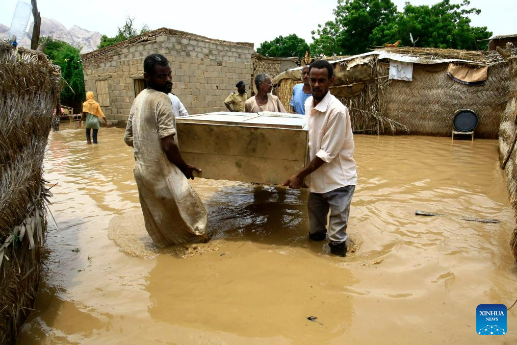 People transfer their belongings after sudden torrential rains hit southern El Sawaqi neighborhood of Kassala city, eastern Sudan, Aug. 3, 2023. (Xinhua/Mohamed Khidir)
