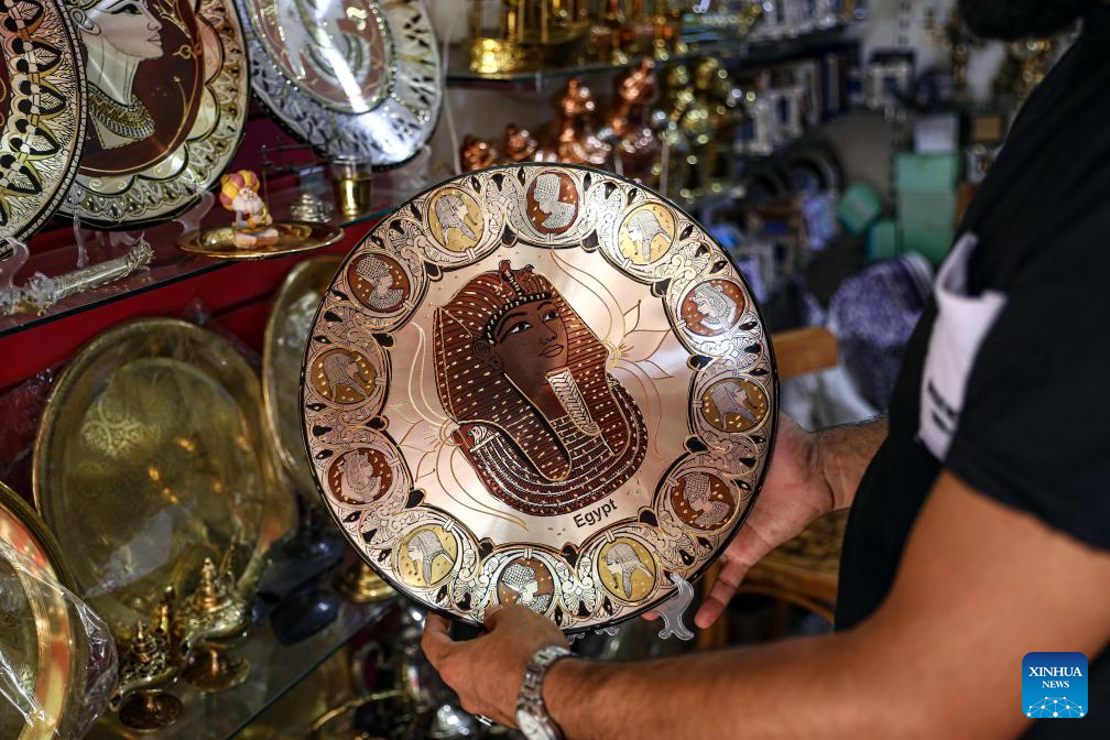 A shopkeeper shows a copper plate in Cairo, Egypt, on Aug. 13, 2023. (Xinhua/Ahmed Gomaa)