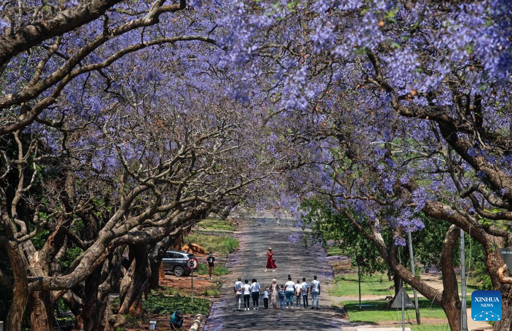 People walk under the jacaranda trees in Pretoria, South Africa on Oct. 17, 2020. South Africa, to hold the 15th BRICS summit this month, is the southernmost country in Africa. It is the only country in the world with three capitals, with Pretoria as its administrative capital, Cape Town as its legislative capital and Bloemfontein the judicial capital. Other major cities include Johannesburg and Durban.
