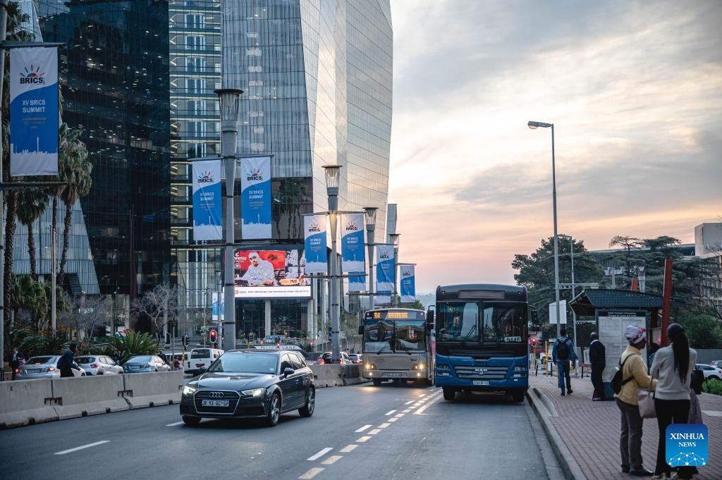 Signboards of the 15th BRICS summit are seen in a street of Johannesburg, South Africa, Aug. 17, 2023. The 15th BRICS summit is to be held in Johannesburg, South Africa, on Aug. 22-24. (Xinhua/Wang Guansen)