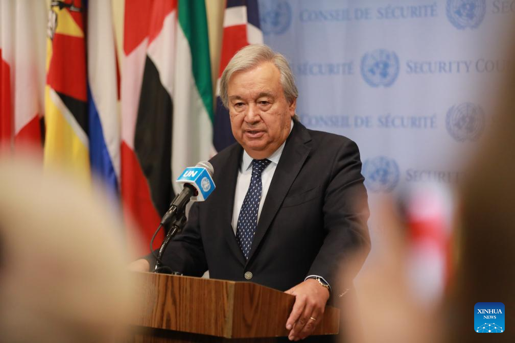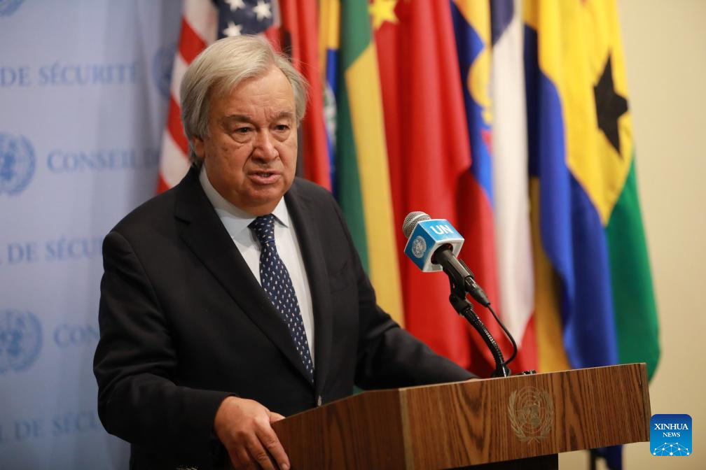 UN Secretary-General Antonio Guterres speaks to the press outside the Security Council Chamber at the UN headquarters in New York, Aug. 31, 2023. Addressing the recent series of military coups predominantly in Africa, UN Secretary-General Antonio Guterres on Thursday underscored the importance of establishing lasting democratic governance backed by the rule of law. (Xinhua/Xie E)