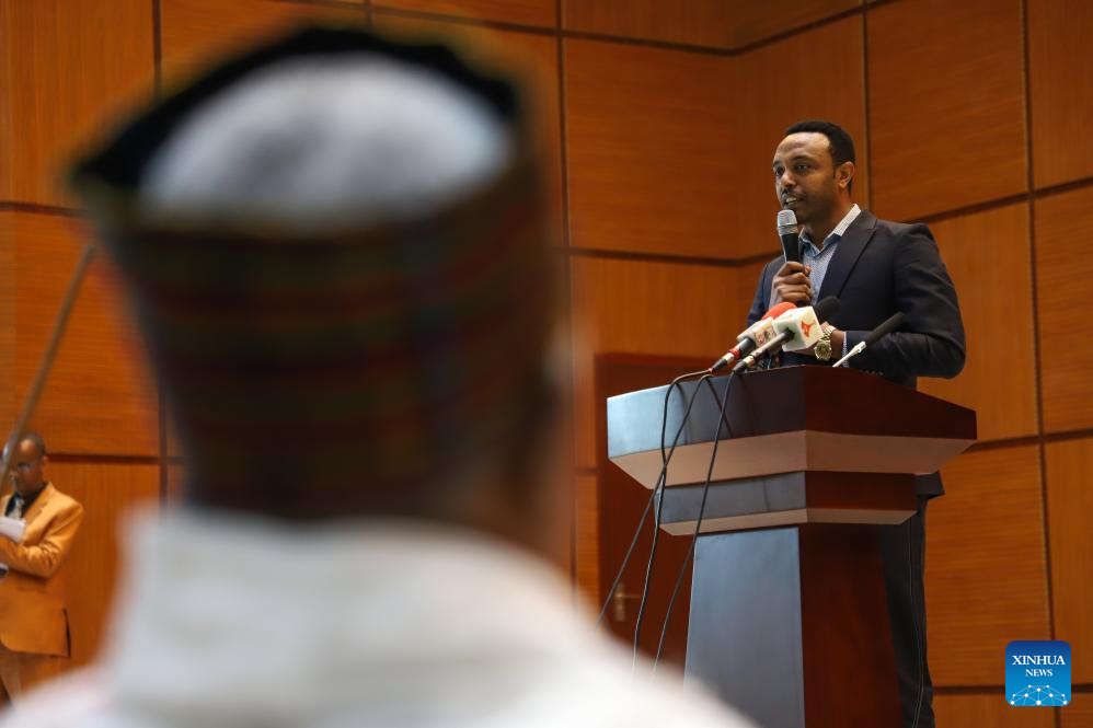 Awel Hassen, administrator of Dukem, speaks during a donation ceremony in Dukem, Oromia regional state of Ethiopia, Sept. 6, 2023. (Xinhua/Michael Tewelde)