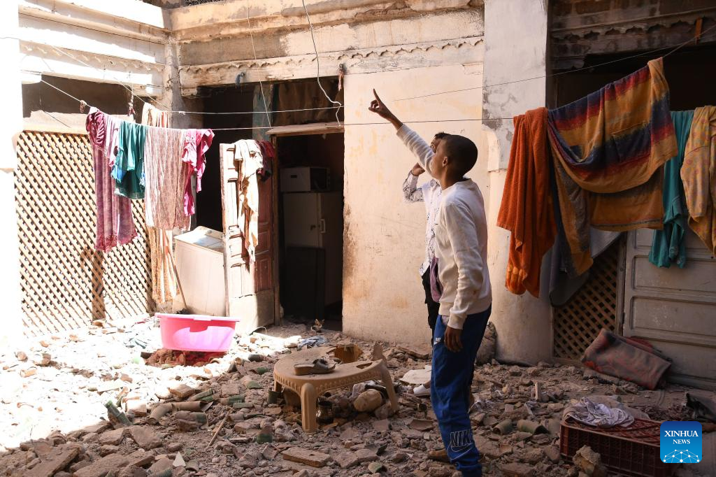People check their damaged house after a 6.8-magnitude earthquake in Marrakesh, Morocco, Sept. 9, 2023. The death toll from a strong earthquake that struck Morocco Friday night has risen to 1,037, said the country's Interior Ministry on Saturday.