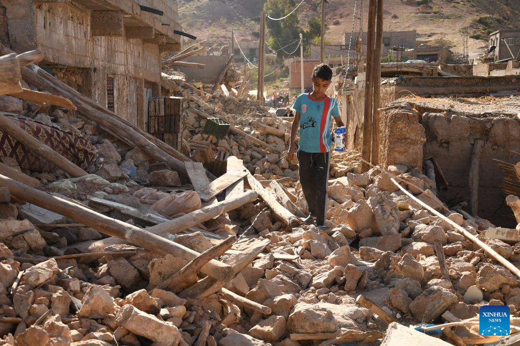 A boy walks in debris near the epicenter of an earthquake in Amizmiz, Morocco, Sept. 10, 2023. At least 2,122 people were killed and 2,421 others injured in a quake hitting central Morocco Friday night, according to the latest update from the Moroccan Interior Ministry on Sunday. (Photo by Saouri Aissa/Xinhua)