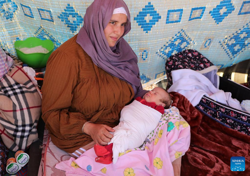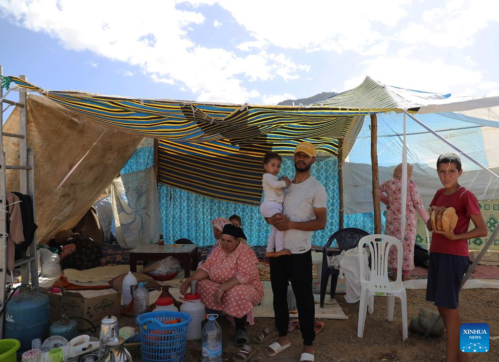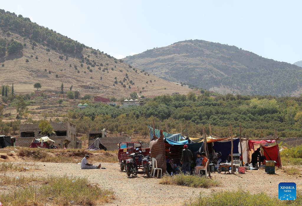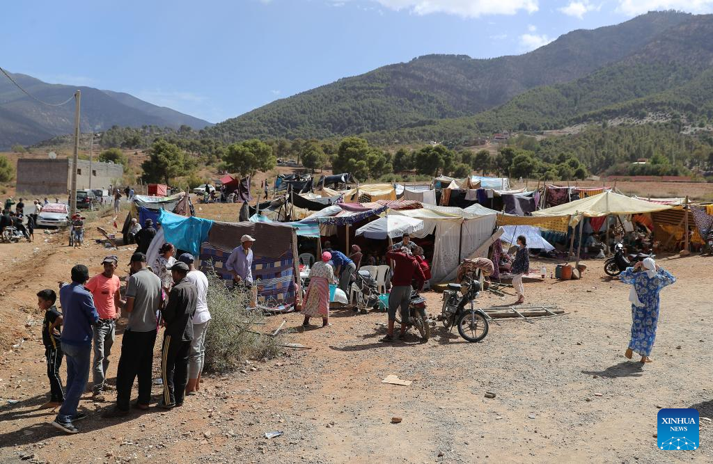 Residents take shelter near the epicenter of an earthquake in Amizmiz, Morocco, Sept. 10, 2023. At least 2,122 people were killed and 2,421 others injured in a quake hitting central Morocco Friday night, according to the latest update from the Moroccan Interior Ministry on Sunday. (Xinhua/Wang Dongzhen)