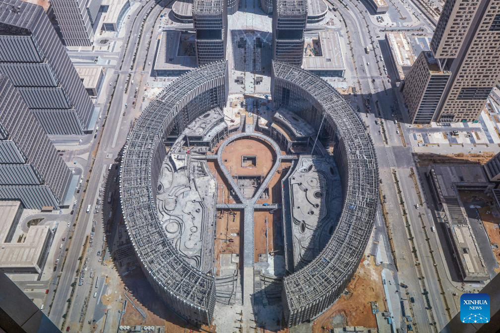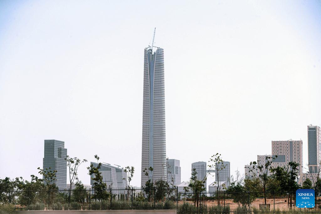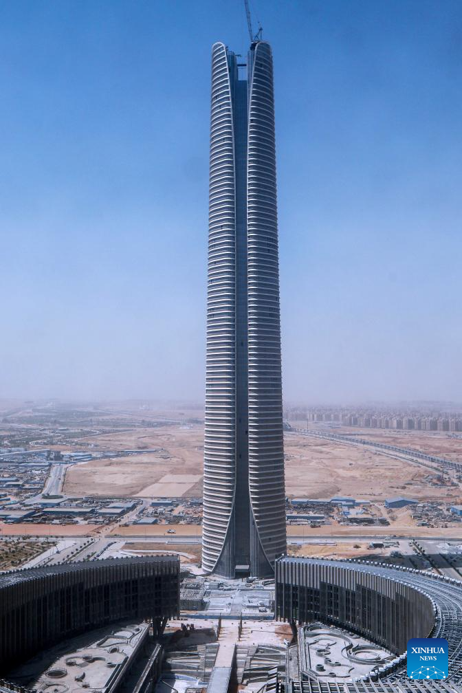 This photo taken on Sept. 11, 2023 shows the construction site of iconic tower of the Central Business District (CBD) project in the new administrative capital, east of Cairo, Egypt. Located in a desert some 50 kilometers east of the Egyptian capital Cairo, the CBD constructed by China State Construction Engineering Corporation (CSCEC) covers an area of about 505,000 square meters and is home to dozens of commercial and residential buildings as well as supporting infrastructure. One of the most eye-catching buildings is the CSCEC-built 385.8-meter-tall Iconic Tower, which will become the highest skyscraper in Africa when it is completed. (Xinhua/Ahmed Gomaa)