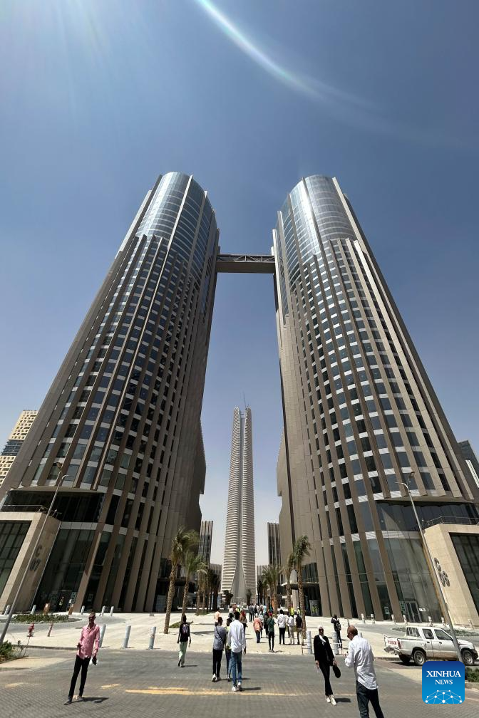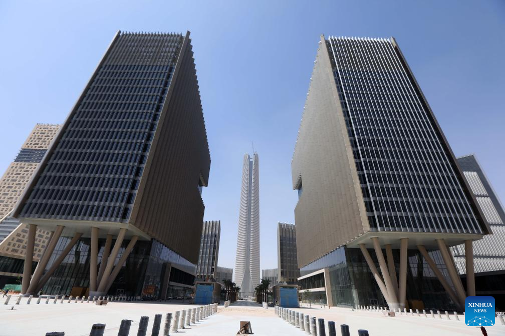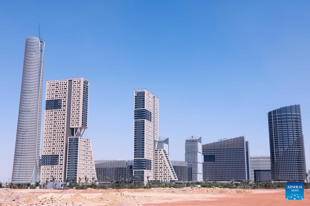This photo taken on Sept. 11, 2023 shows the construction site of Central Business District (CBD) project in the new administrative capital, east of Cairo, Egypt. Located in a desert some 50 kilometers east of the Egyptian capital Cairo, the CBD constructed by China State Construction Engineering Corporation (CSCEC) covers an area of about 505,000 square meters and is home to dozens of commercial and residential buildings as well as supporting infrastructure. One of the most eye-catching buildings is the CSCEC-built 385.8-meter-tall Iconic Tower, which will become the highest skyscraper in Africa when it is completed. (Xinhua/Ahmed Gomaa)