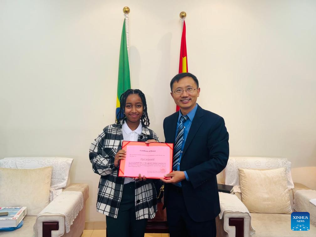 Ethiopian teenager Abigail Berhanemeskel holding a certificate of honor poses with Shen Qinmin, the minister counselor at the Chinese Embassy in Ethiopia, in Addis Ababa, Ethiopia, on June 8, 2023. (Chinese Embassy in Ethiopia/Handout via Xinhua)