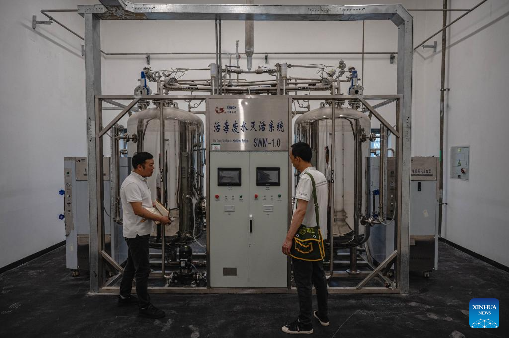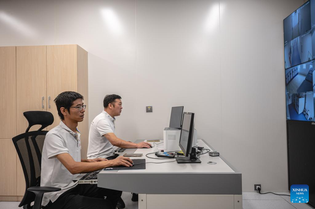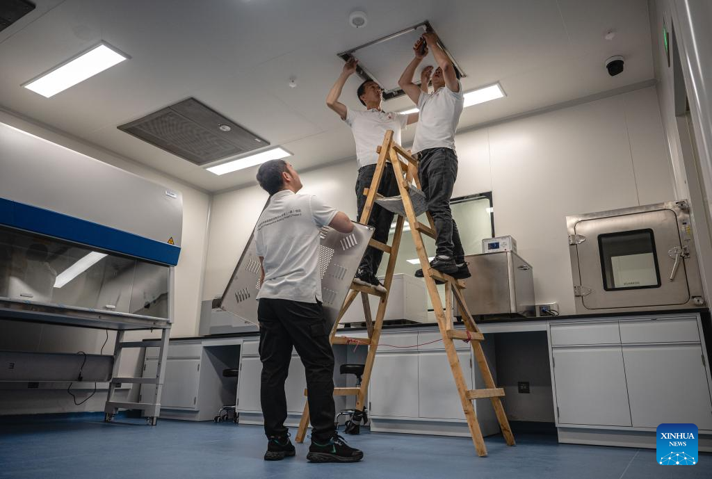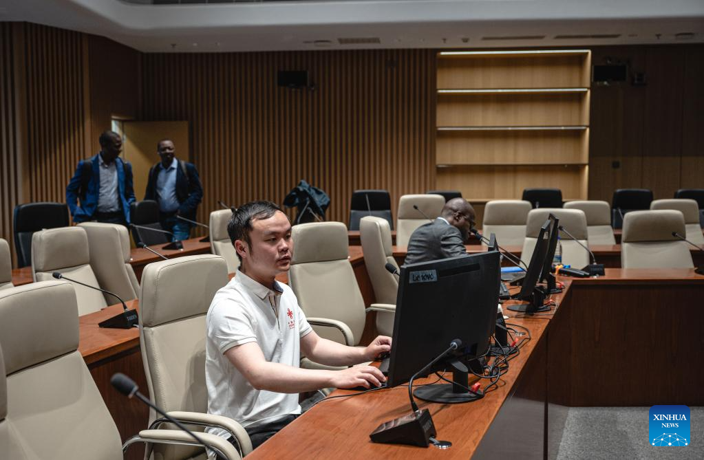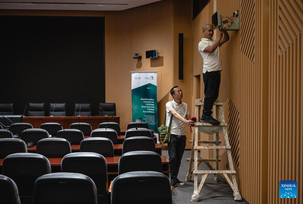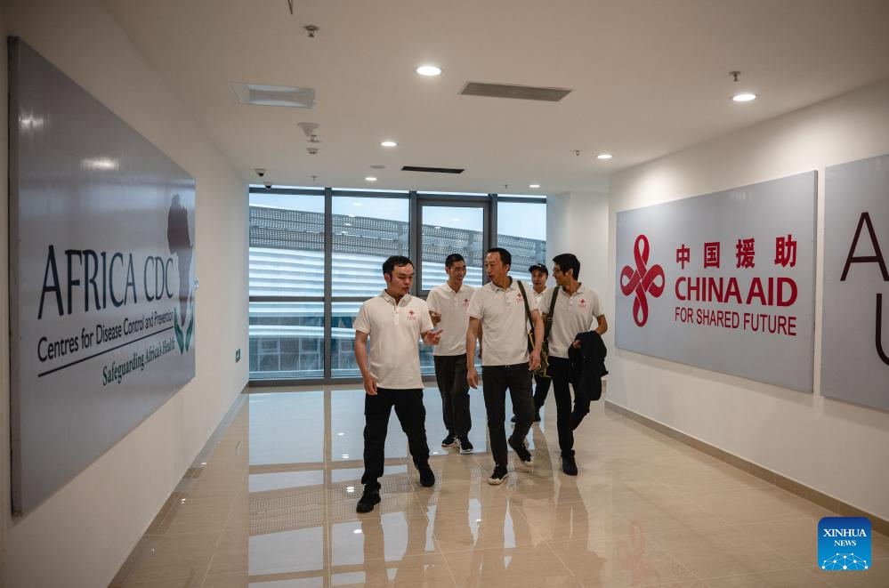 Staff members of the Chinese technical service team examine facilities at the headquarters of the Africa Centers for Disease Control and Prevention (Africa CDC) in Addis Ababa, Ethiopia, Sept. 11, 2023. Located in the southern suburbs of Addis Ababa, the China-aided headquarters of the Africa CDC was officially inaugurated in January 2023.