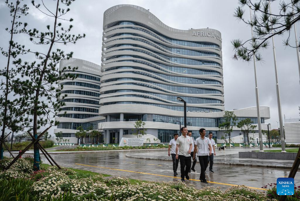 Staff members of the Chinese technical service team walk at the headquarters of the Africa Centers for Disease Control and Prevention (Africa CDC) in Addis Ababa, Ethiopia, Sept. 11, 2023. Located in the southern suburbs of Addis Ababa, the China-aided headquarters of the Africa CDC was officially inaugurated in January 2023.