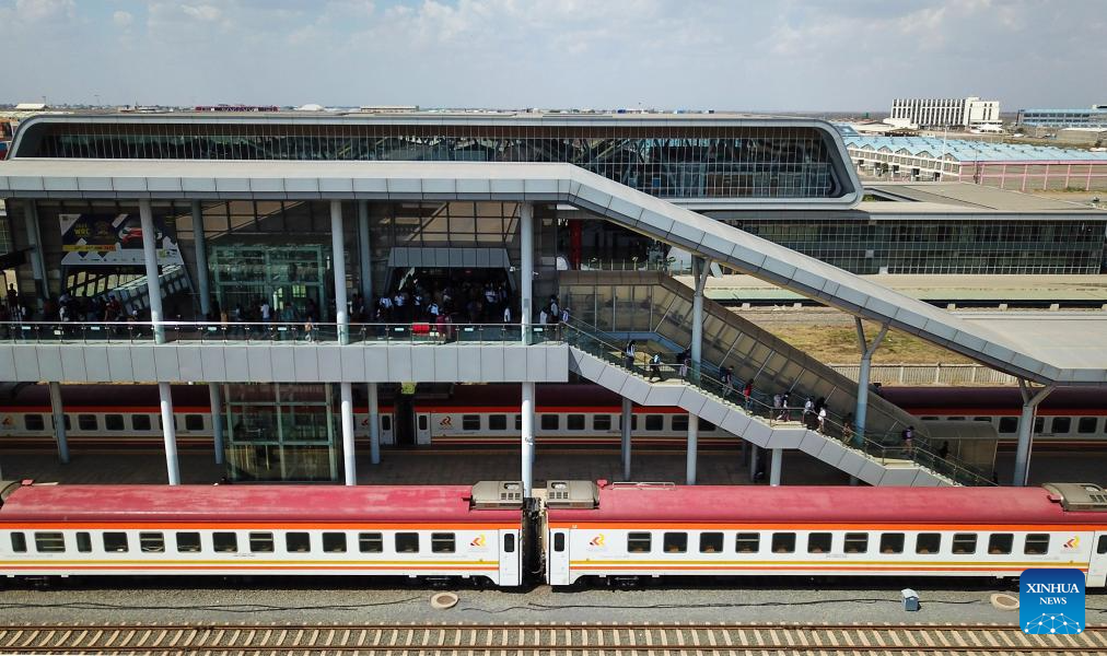 This aerial photo taken on Sept. 20, 2023 shows passengers preparing to board the train to Mombasa at Nairobi Terminus Station of the China built Mombasa-Nairobi Standard Gauge Railway (SGR) in Nairobi, Kenya. In 2017, the SGR, built and operated by China Road and Bridge Corporation, was officially opened to traffic. As the first railway built since Kenya's independence, it runs 480 km between the capital Nairobi and the port city of Mombasa. Cutting the travel time between the two cities by five hours, it also reduces overall logistics costs by about 40 percent. (Xinhua/Han Xu)