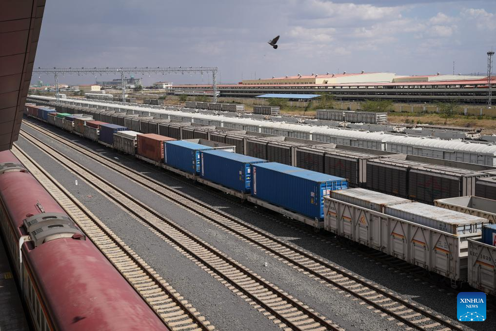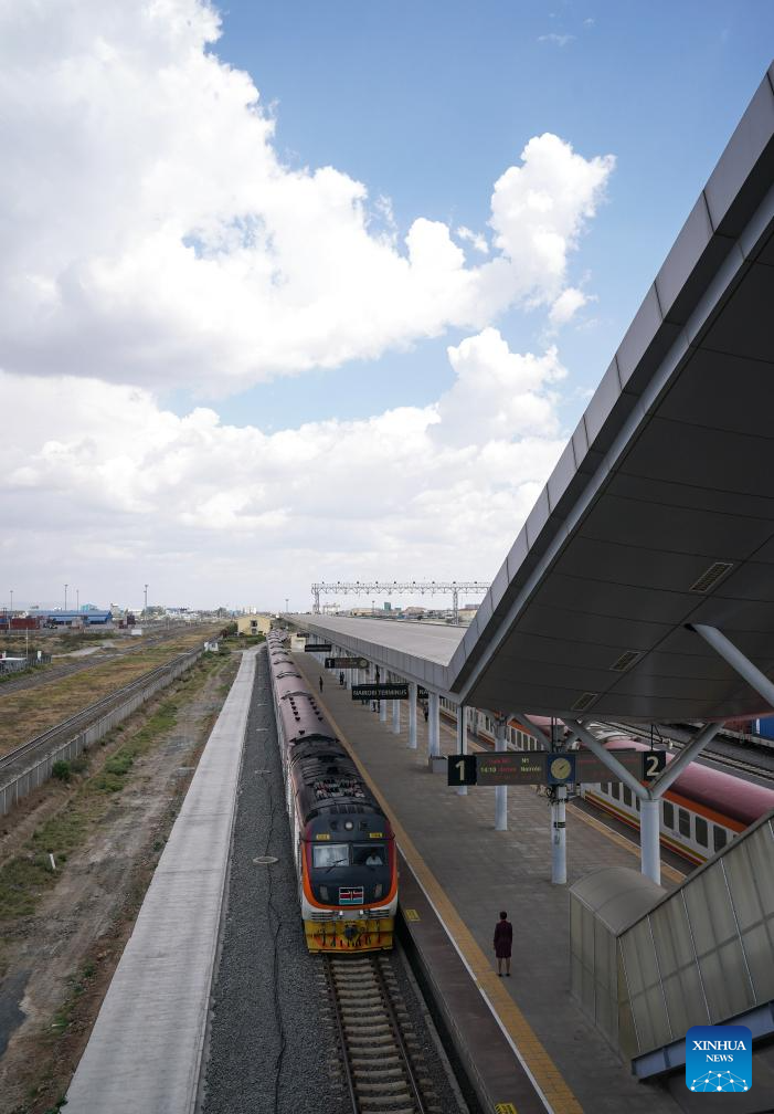 A train from Mombasa pulls into Nairobi Terminus Station of the China built Mombasa-Nairobi Standard Gauge Railway (SGR) in Nairobi, Kenya, Sept. 20, 2023. In 2017, the SGR, built and operated by China Road and Bridge Corporation, was officially opened to traffic. As the first railway built since Kenya's independence, it runs 480 km between the capital Nairobi and the port city of Mombasa. Cutting the travel time between the two cities by five hours, it also reduces overall logistics costs by about 40 percent. (Xinhua/Han Xu)