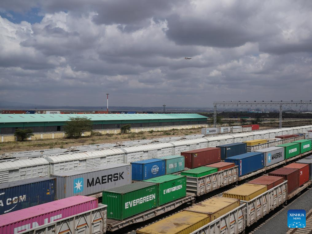 This aerial photo taken on Sept. 20, 2023 shows a view of the Nairobi Terminus Station of the China built Mombasa-Nairobi Standard Gauge Railway (SGR) in Nairobi, Kenya. In 2017, the SGR, built and operated by China Road and Bridge Corporation, was officially opened to traffic. As the first railway built since Kenya's independence, it runs 480 km between the capital Nairobi and the port city of Mombasa. Cutting the travel time between the two cities by five hours, it also reduces overall logistics costs by about 40 percent. (Xinhua/Han Xu)