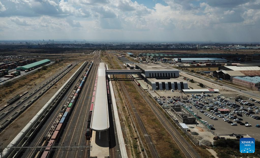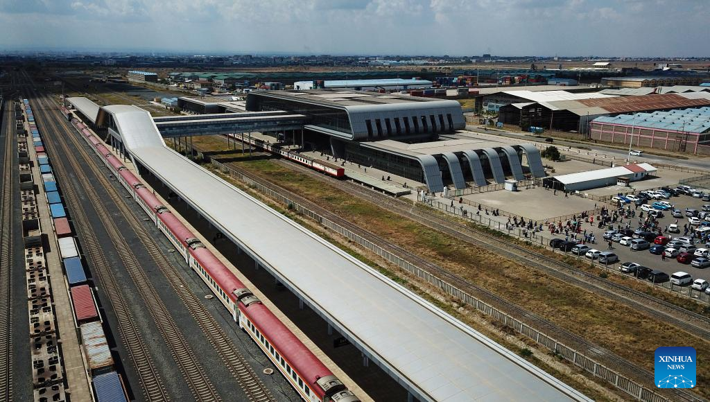 This aerial photo taken on Sept. 20, 2023 shows the Nairobi Terminus Station of the China built Mombasa-Nairobi Standard Gauge Railway (SGR) in Nairobi, Kenya. In 2017, the SGR, built and operated by China Road and Bridge Corporation, was officially opened to traffic. As the first railway built since Kenya's independence, it runs 480 km between the capital Nairobi and the port city of Mombasa. Cutting the travel time between the two cities by five hours, it also reduces overall logistics costs by about 40 percent. (Xinhua/Han Xu)