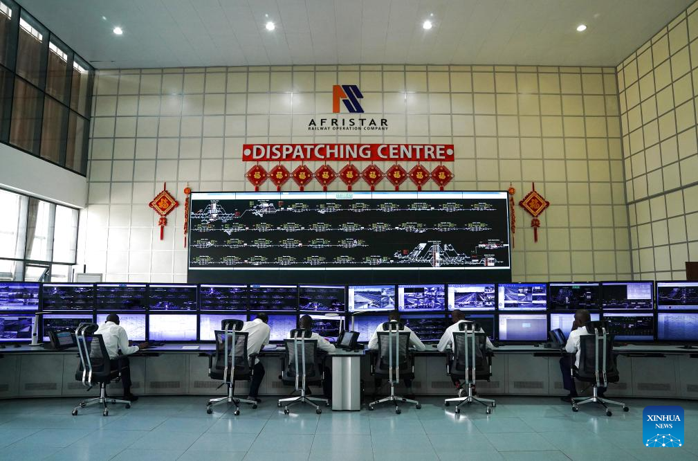 This photo taken on Sept. 20, 2023 shows a view of dispatching centre hall of the China built Mombasa-Nairobi Standard Gauge Railway (SGR) in Nairobi, Kenya. In 2017, the SGR, built and operated by China Road and Bridge Corporation, was officially opened to traffic. As the first railway built since Kenya's independence, it runs 480 km between the capital Nairobi and the port city of Mombasa. Cutting the travel time between the two cities by five hours, it also reduces overall logistics costs by about 40 percent. (Xinhua/Han Xu)