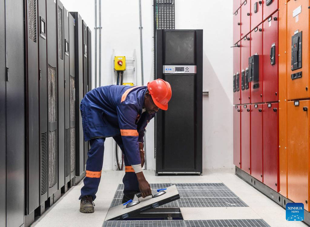 A worker works in the Digital Delta Data Center in Gaborone, Botswana, Sept. 11, 2023. The Digital Delta Data Center (DDDC) is located in the Botswana Innovation Hub in Gaborone. Undertaken by the Botswanan branch of China Jiangxi International Economic and Technical Cooperation Co.,Ltd. (CJIC), the project includes a two-storey data center building with ancillary facilities. The project is expected to be delivered to Botswana Fibre Networks (BoFiNet) in October 2023. (Xinhua/Li Yahui)