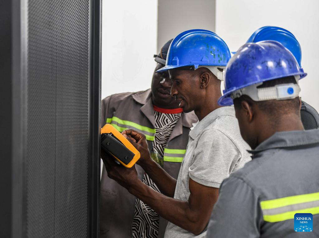 Workers carry out testing work in the Digital Delta Data Center in Gaborone, Botswana, Sept. 11, 2023. The Digital Delta Data Center (DDDC) is located in the Botswana Innovation Hub in Gaborone. Undertaken by the Botswanan branch of China Jiangxi International Economic and Technical Cooperation Co.,Ltd. (CJIC), the project includes a two-storey data center building with ancillary facilities. The project is expected to be delivered to Botswana Fibre Networks (BoFiNet) in October 2023. (Xinhua/Li Yahui)