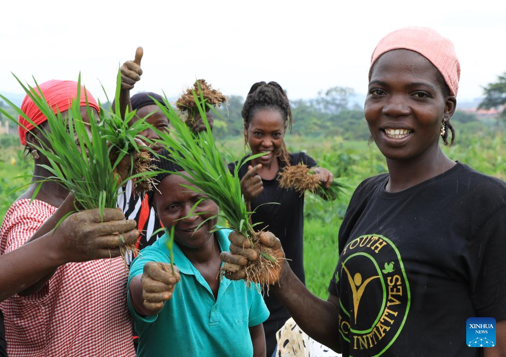 Local employees display rice seedlings at the Nigerian Agricultural Technology Demonstration Center in Abuja, Nigeria, Sept. 19, 2023. The China-aided Nigerian Agricultural Technology Demonstration Center is located in the CGCOC Agriculture Abuja High-tech Industrial Park in Abuja. Construction of the project started in March 2021 and completed in Sept. 2022. China handed over the project to Nigeria on Dec. 6, 2022. (Xinhua/Dong Jianghui)