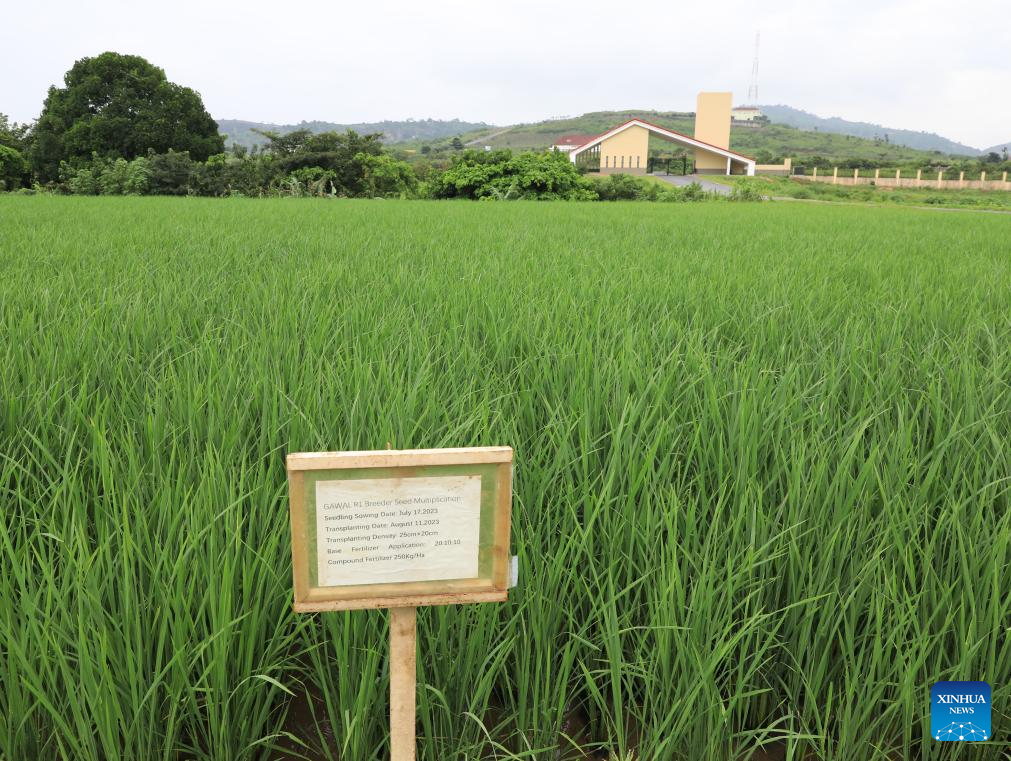 This photo taken on Sept. 19, 2023 shows the rice variety GAWAL R1 developed by Green Agriculture West Africa Ltd. at the Nigerian Agricultural Technology Demonstration Center in Abuja, Nigeria. The China-aided Nigerian Agricultural Technology Demonstration Center is located in the CGCOC Agriculture Abuja High-tech Industrial Park in Abuja. Construction of the project started in March 2021 and completed in Sept. 2022. China handed over the project to Nigeria on Dec. 6, 2022. (Xinhua/Dong Jianghui)