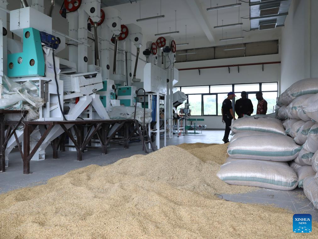 This photo taken on Sept. 19, 2023 shows a rice milling processing room at the Nigerian Agricultural Technology Demonstration Center in Abuja, Nigeria. The China-aided Nigerian Agricultural Technology Demonstration Center is located in the CGCOC Agriculture Abuja High-tech Industrial Park in Abuja. Construction of the project started in March 2021 and completed in Sept. 2022. China handed over the project to Nigeria on Dec. 6, 2022. (Xinhua/Dong Jianghui)
