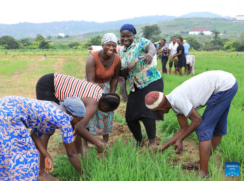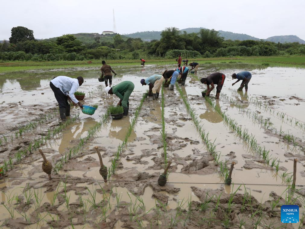 Local employees plant rice seedlings at the Nigerian Agricultural Technology Demonstration Center in Abuja, Nigeria, Sept. 19, 2023. The China-aided Nigerian Agricultural Technology Demonstration Center is located in the CGCOC Agriculture Abuja High-tech Industrial Park in Abuja. Construction of the project started in March 2021 and completed in Sept. 2022. China handed over the project to Nigeria on Dec. 6, 2022. (Xinhua/Dong Jianghui)