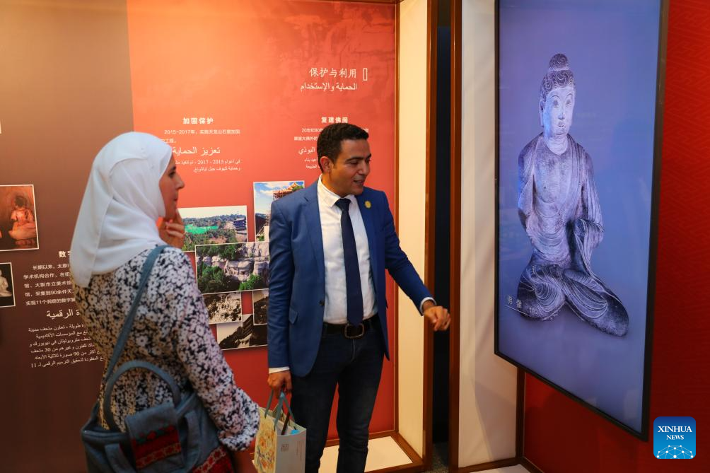 A digital restoration international tour exhibition of Taiyuan Tianlongshan Grottoes kicked off on Saturday at the China Cultural Center in Cairo, attracting more than 70 experts and scholars in the field of archaeology and museums from both China and Egypt on the first day. (Xinhua/Sui Xiankai)