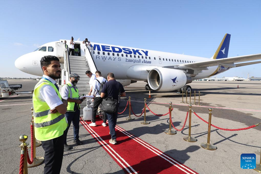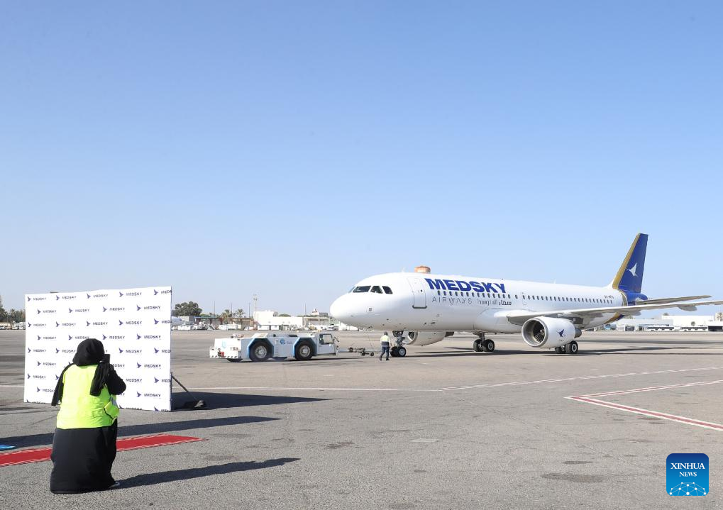 This photo taken on Sept. 30, 2023 shows a flight of Medsky Airways at Mitiga International Airport in Tripoli, Libya. A Rome-bound flight took off Saturday here in the Libyan capital, resuming direct scheduled flights between Libya and Italy after a nearly 10-year halt. (Photo by Hamza Turkia/Xinhua)
