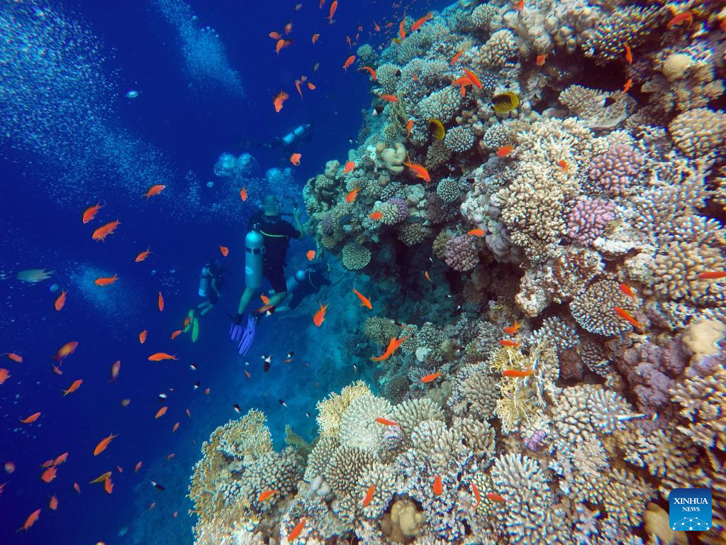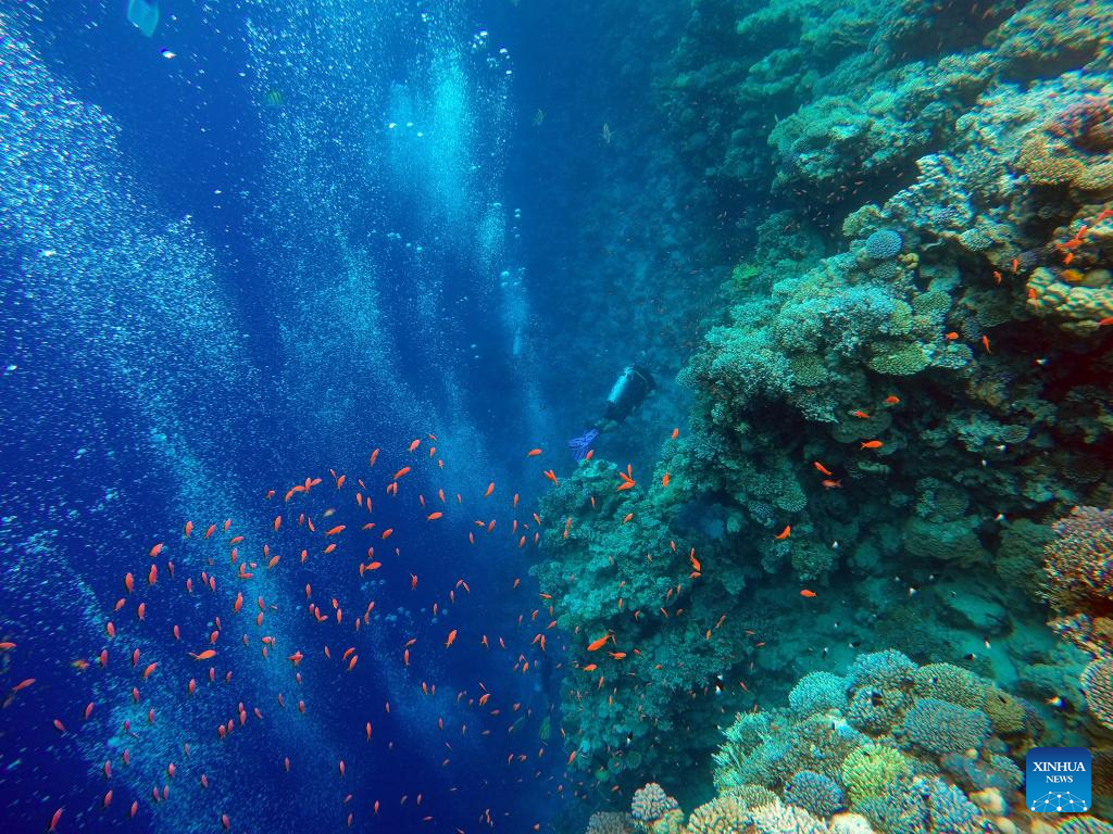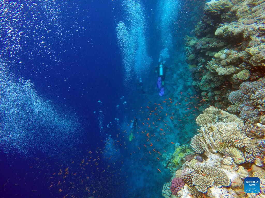 People dive around corals in the Blue Hole in Dahab, Egypt, on Oct. 2, 2023. Dahab, a town on the southeast coast of the Sinai Peninsula in Egypt, is world-renowned for many of its dive spots including the Blue Hole. (Xinhua/Sui Xiankai)