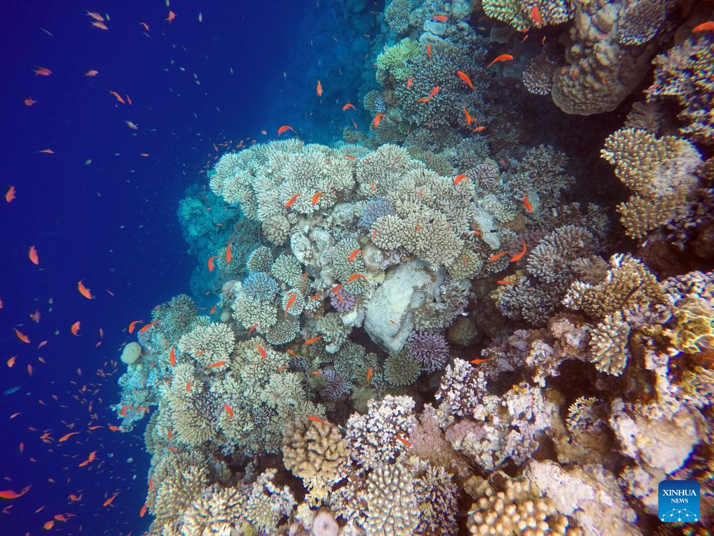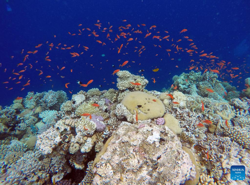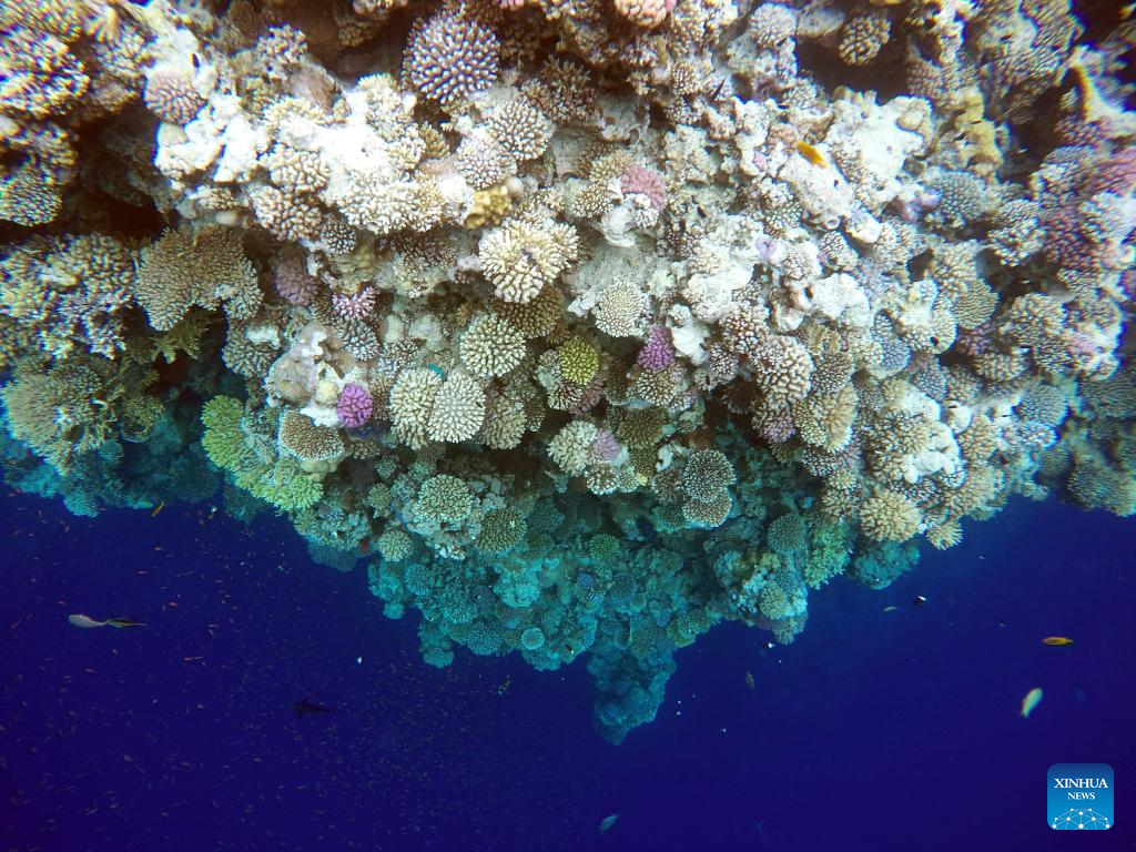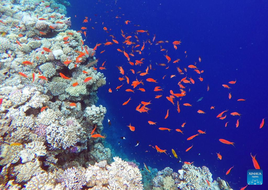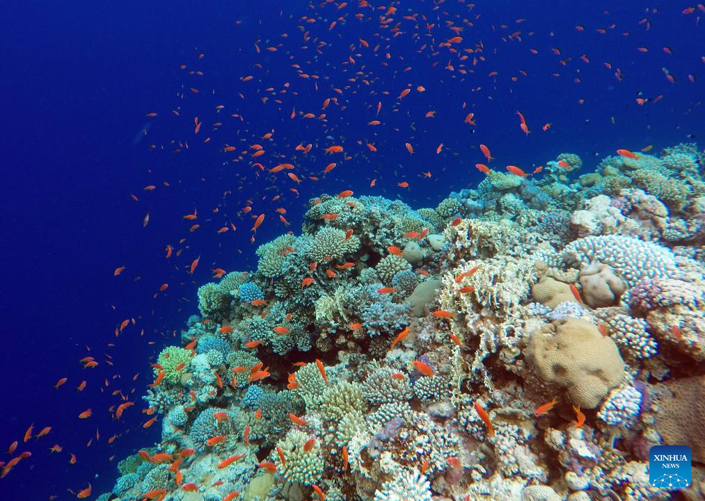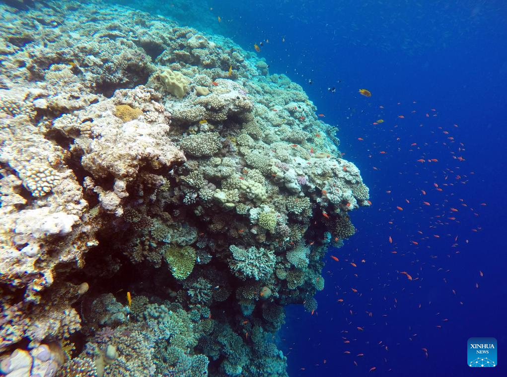 Fish swim around corals in the Blue Hole in Dahab, Egypt, on Oct. 2, 2023. Dahab, a town on the southeast coast of the Sinai Peninsula in Egypt, is world-renowned for many of its dive spots including the Blue Hole. (Xinhua/Sui Xiankai)