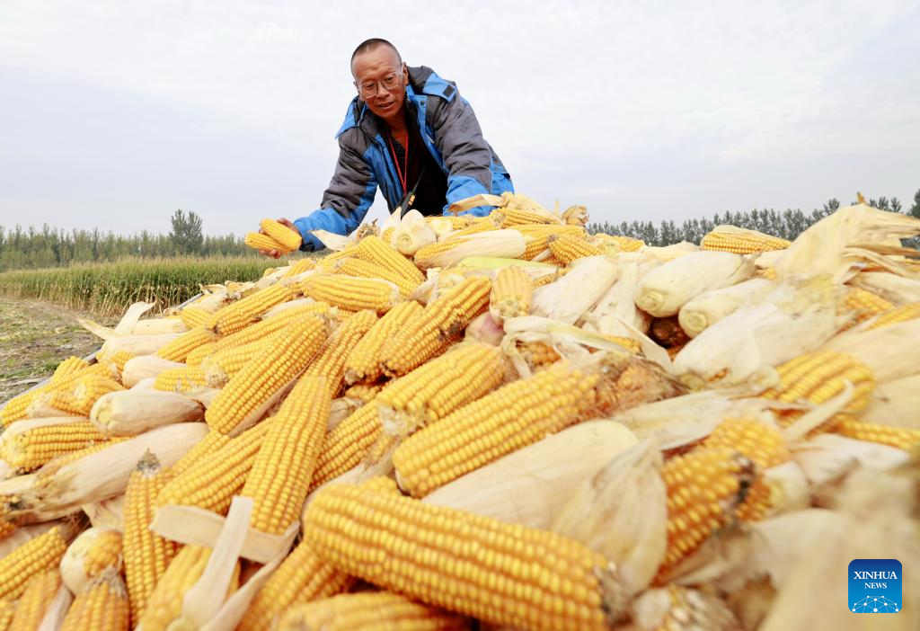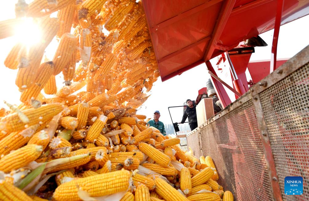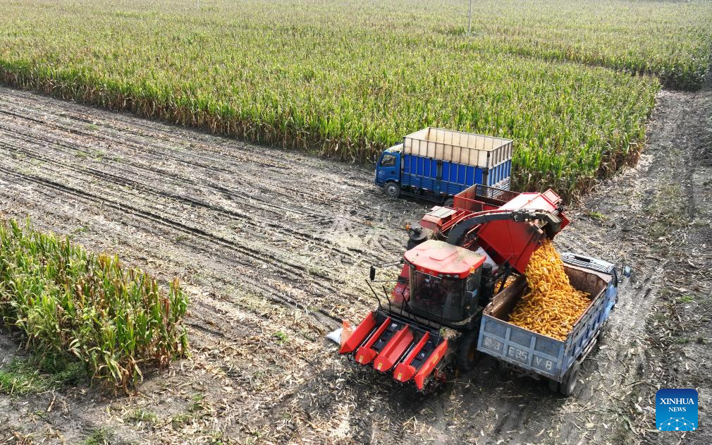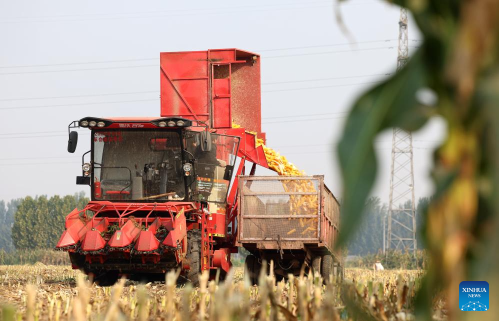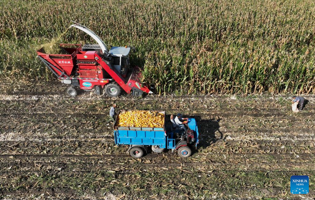 Farmers harvest corns at Zhoujiazhuang Village in Jinzhou City, north China's Hebei Province, Oct. 8, 2023. (Photo by Liang Zidong/Xinhua)