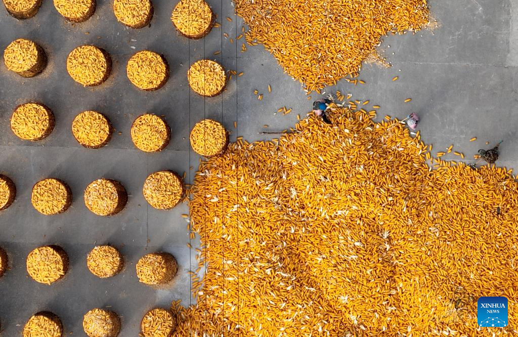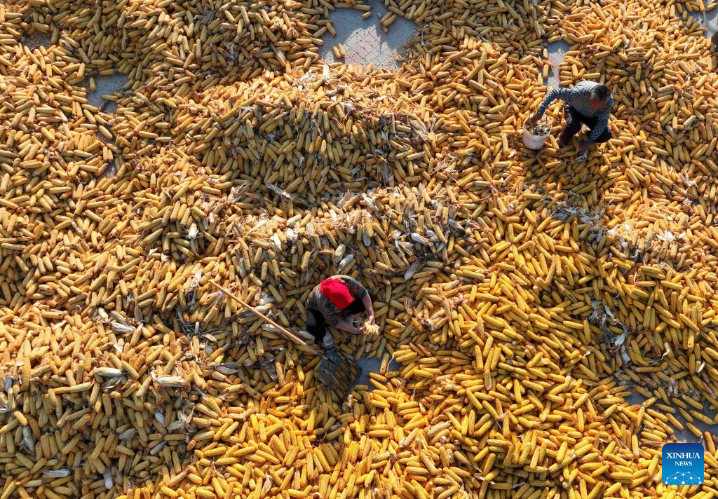 Farmers dry corns at Zhoujiazhuang Village in Jinzhou City, north China's Hebei Province, Oct. 8, 2023. (Photo by Liang Zidong/Xinhua)