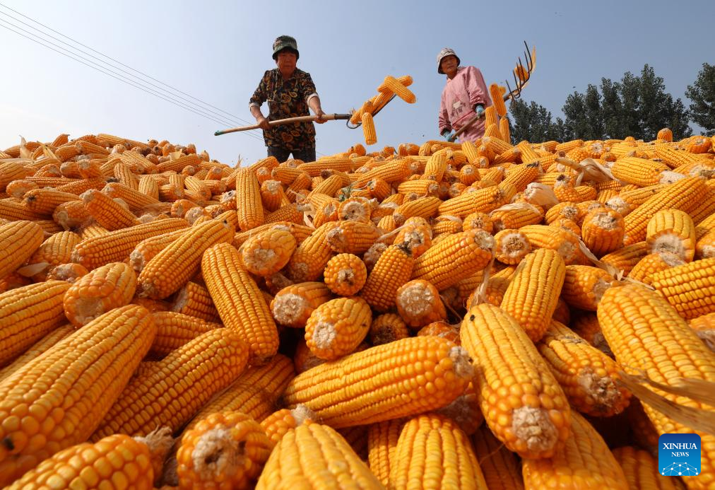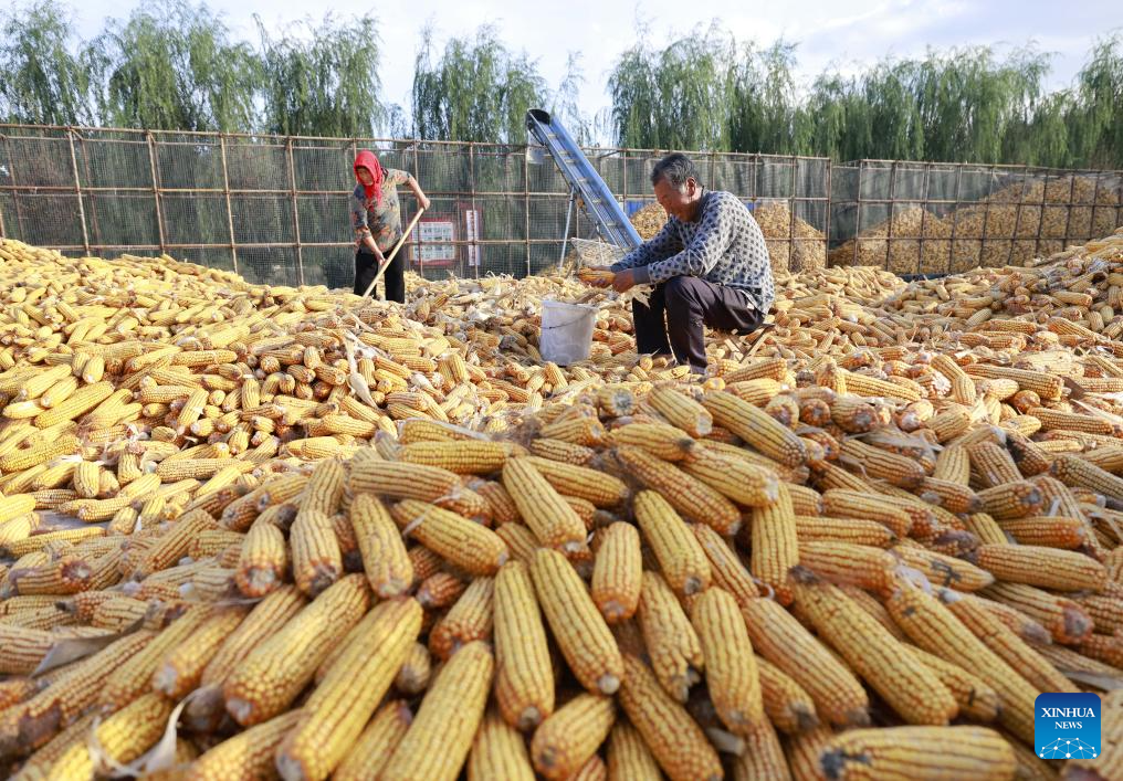 Farmers husk corns at Kongjiazhuang Village of Tangshan City in north China's Hebei Province, Oct. 4, 2023 (Xinhua/Yang Shiyao)