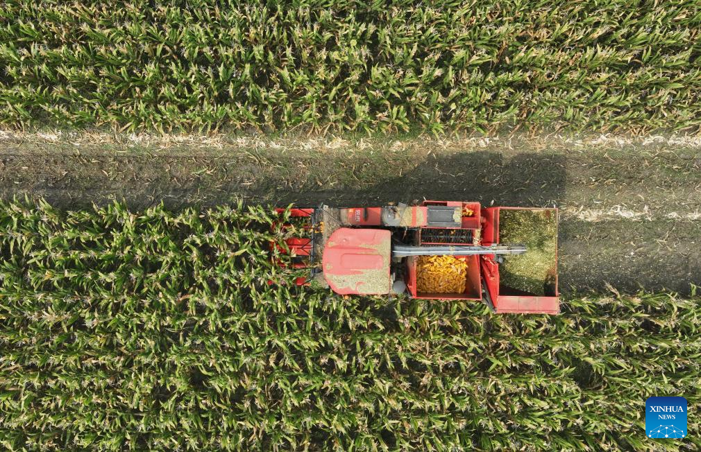 This aerial photo taken on Oct. 3, 2023 shows a harvester operating at a corn field at Chahe Township of Tangshan City in north China's Hebei Province. (Xinhua/Yang Shiyao)