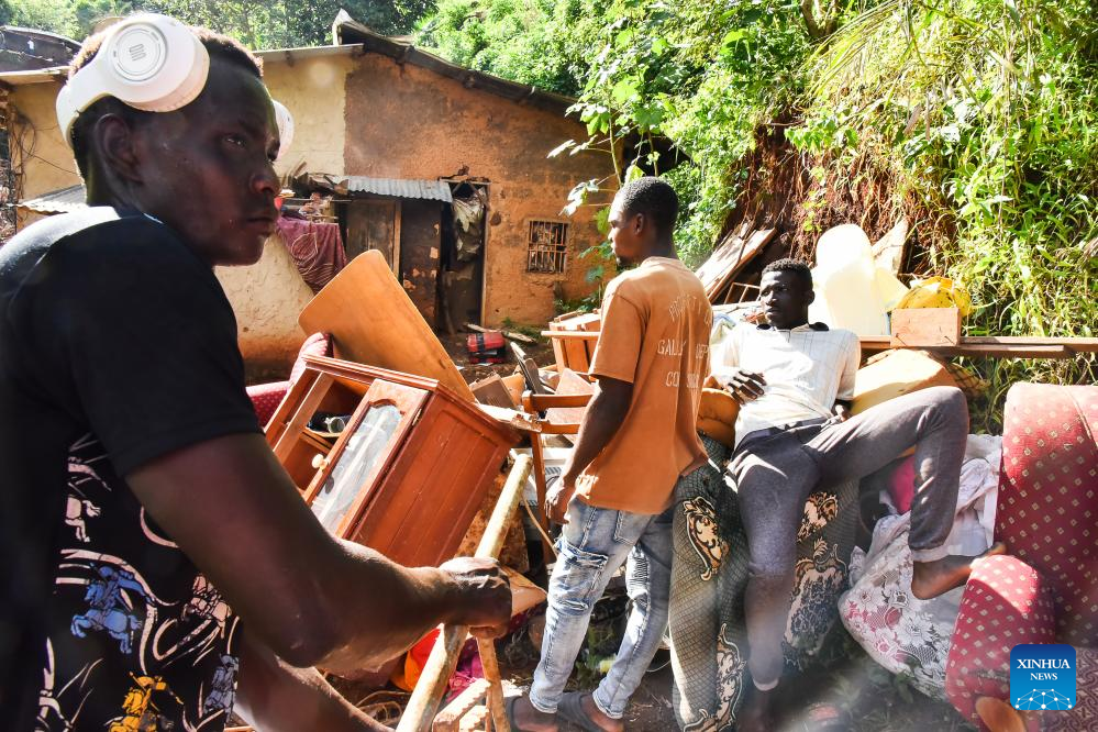 Survivors are seen among their belongings at the site of landslides in Yaounde, Cameroon, on Oct. 9, 2023. Rescuers pulled out three more bodies later Monday after landslides in Yaounde buried homes and buildings Sunday, bringing the death toll of the disaster to 30, officials said. (Photo by Kepseu/Xinhua)