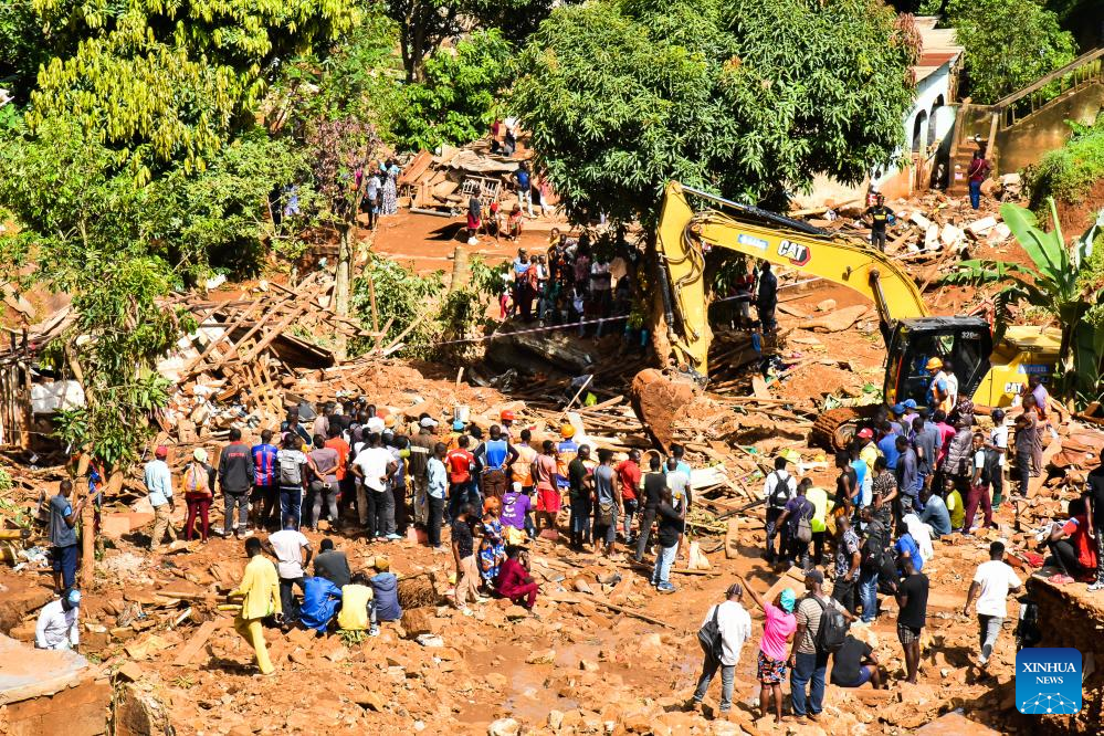 People search for survivors at the site of landslides in Yaounde, Cameroon, on Oct. 9, 2023. Rescuers pulled out three more bodies later Monday after landslides in Yaounde buried homes and buildings Sunday, bringing the death toll of the disaster to 30, officials said. (Photo by Kepseu/Xinhua)