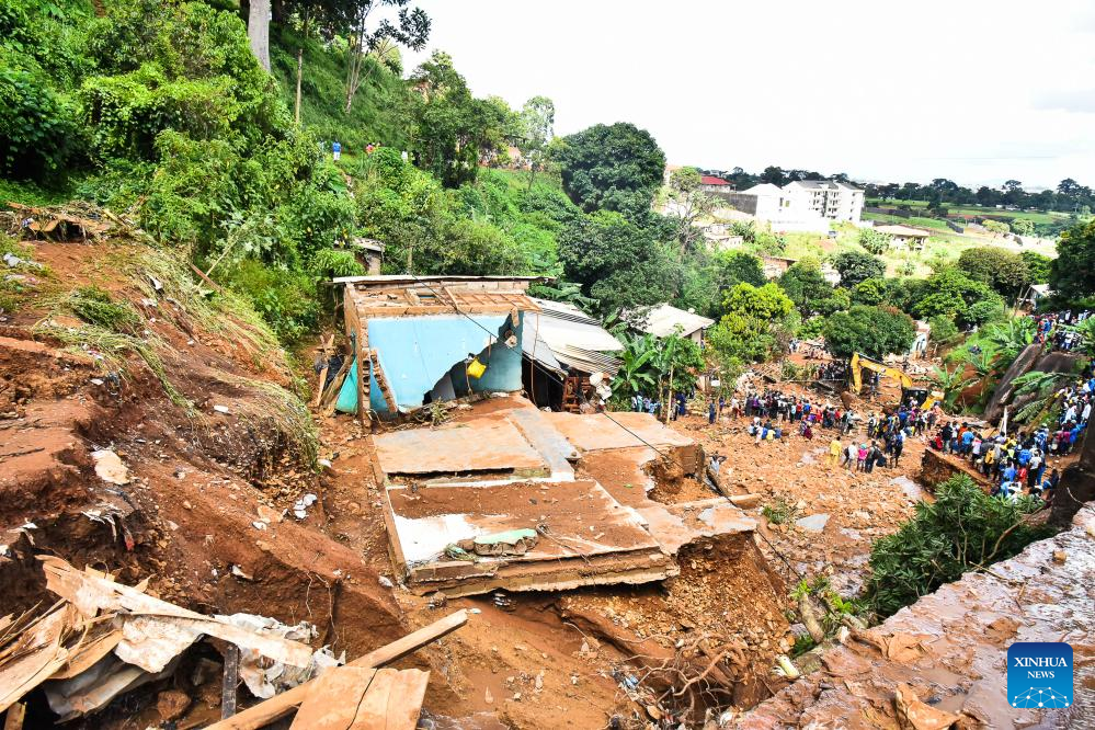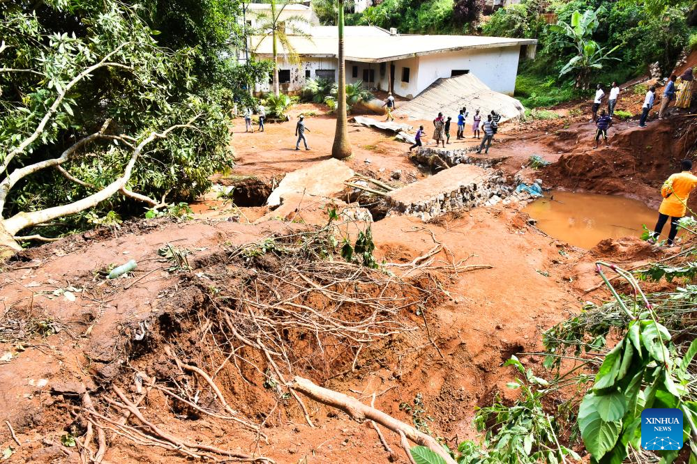 Photo taken on Oct. 9, 2023 shows the site of landslides in Yaounde, Cameroon. Rescuers pulled out three more bodies later Monday after landslides in Yaounde buried homes and buildings Sunday, bringing the death toll of the disaster to 30, officials said. (Photo by Kepseu/Xinhua)