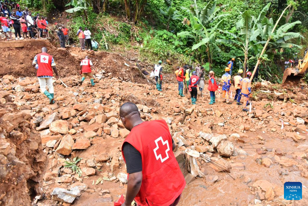 Red Cross and civil protection personnel work at the site of landslides in Yaounde, Cameroon, on Oct. 9, 2023. Rescuers pulled out three more bodies later Monday after landslides in Yaounde buried homes and buildings Sunday, bringing the death toll of the disaster to 30, officials said. (Photo by Kepseu/Xinhua)