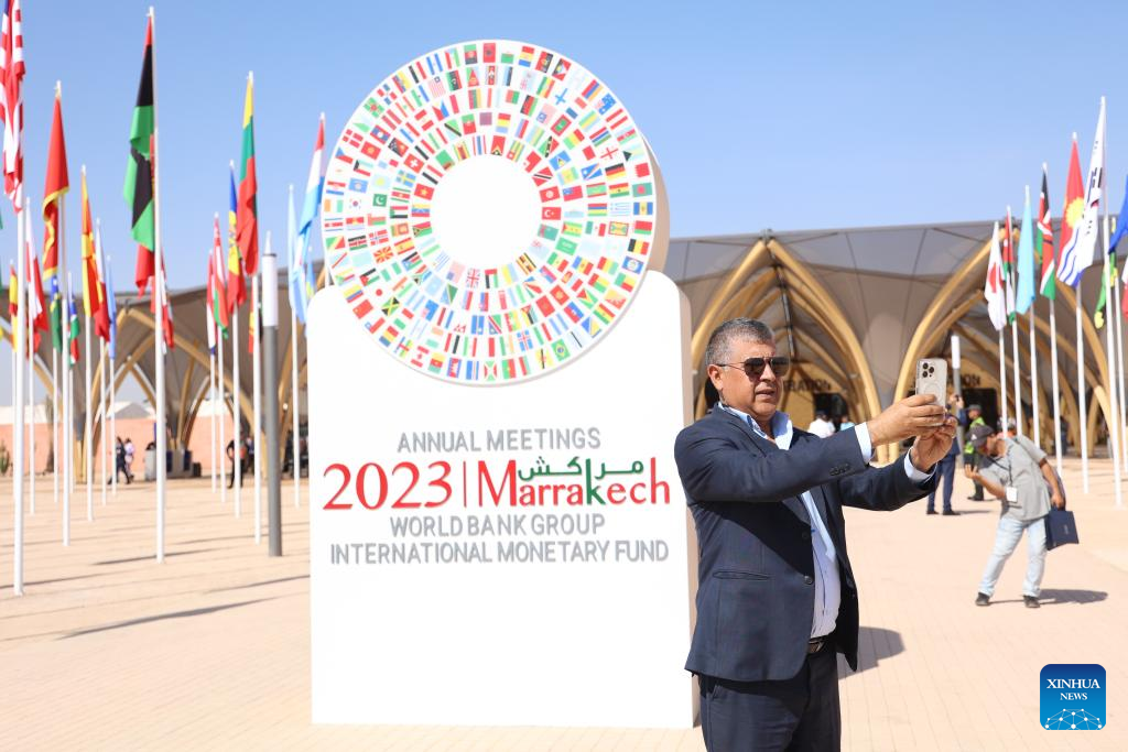 A participant takes a selfie with the logo of the World Bank Group and International Monetary Fund (IMF) annual meetings in Marrakech, Morocco, Oct. 9, 2023. The annual meetings opened Monday in the southern Moroccan city of Marrakech. The meetings will run from Monday through Sunday and are expected to gather more than 12,000 participants, including 190 delegations led by finance ministers and central bankers, as well as private sector executives worldwide, Morocco's national agency MAP reported. (Xinhua/Huo Jing)