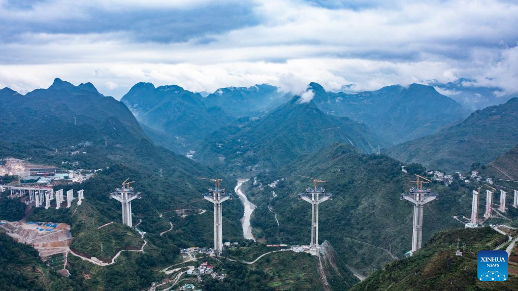 Workers work at the construction site of Liuzhi grand bridge on Nayong-Qinglong Expressway in southwest China's Guizhou Province, Oct. 9, 2023.