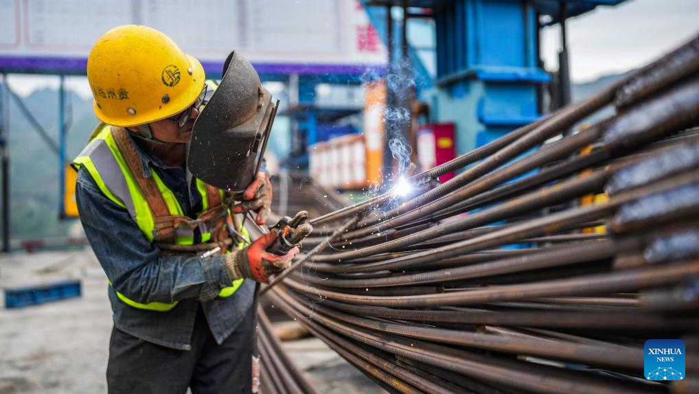 A welder works at the construction site of Liuzhi grand bridge on Nayong-Qinglong Expressway in southwest China's Guizhou Province, Oct. 9, 2023.