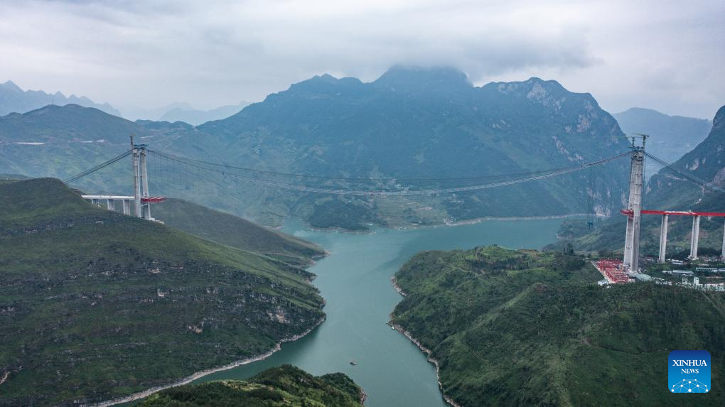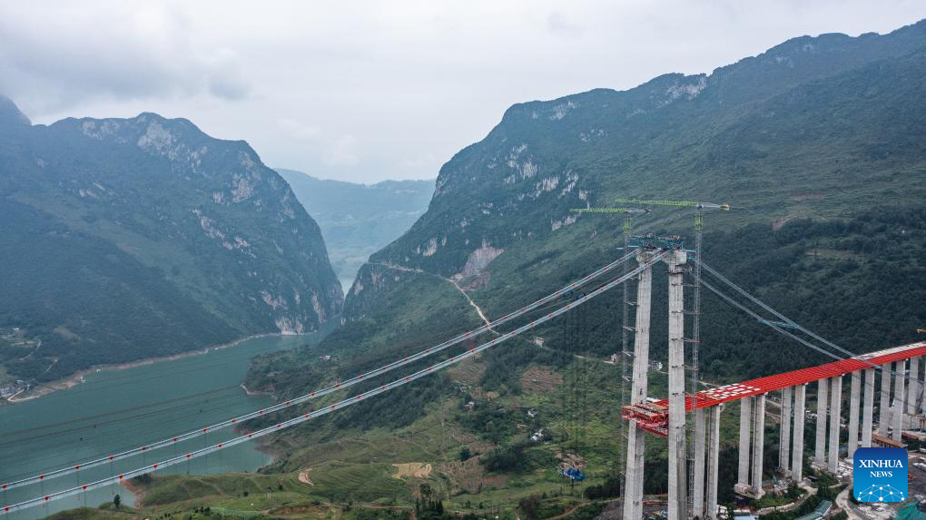 This aerial photo taken on Oct. 10, 2023 shows the construction site of Wumeng Mountain bridge on Nayong-Qinglong Expressway in southwest China's Guizhou Province.